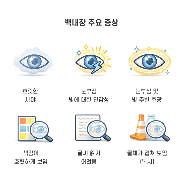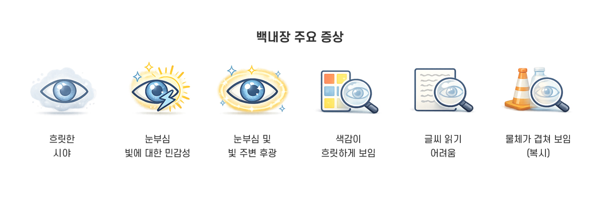 백내장은 눈 속 카메라의 렌즈와 같은 역할을 하는 수정체가 혼탁해지면서 시야가 흐릿하게 보이는 질환입니다.