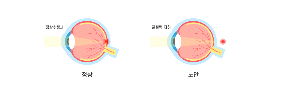 수정체의 탄력이 떨어지면서 초점 조절이 어려워지는 것이 주요 원인입니다.